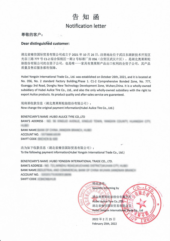 Con il continuo sviluppo dell'industria della società, per fornire servizi migliori, aprire un nuovo capitolo, padroneggiare il mercato e comprendere le informazioni del settore in modo più professionale e completo, il dipartimento del commercio estero di Hubei Aulice Tyre Co., Ltd ha ufficialmente svelato e istituito Hubei Yongxin International Trade Co., Ltd dopo la discussione e la decisione del management della società di tenere il passo con lo sviluppo del settore e migliorare le capacità di ricerca e sviluppo di mercato.
